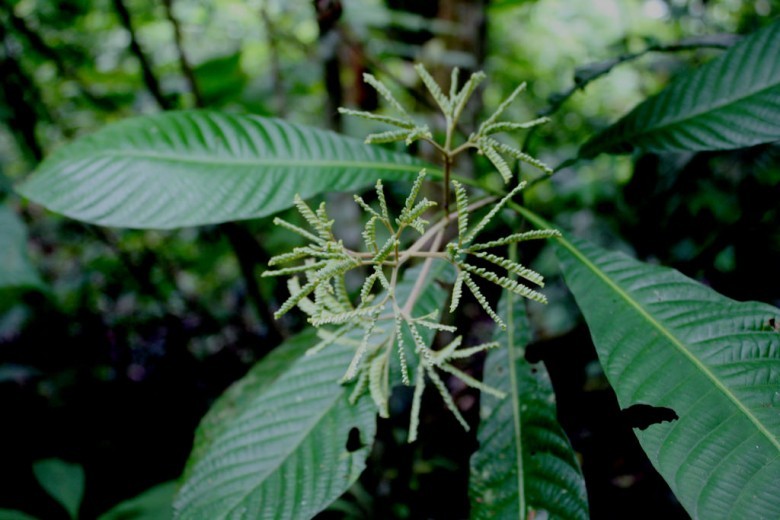 Mô tả: Cây nhỡ hay cây gỗ nhỏ cao 2,5-7m, có nhánh có lông mang các sẹo lá và các lá kèm đã rụng. Lá hình thon ngược, thon hẹp dài và nhọn ở gốc, có đuôi nhọn mũi sắc ở đầu, dài 20-40cm, rộng 3-15cm, sẫm màu và hầu như nhẵn ở trên, sáng màu hơn và có lông mịn ở mặt dưới, hơi dai. Hoa trắng, không cuống, rất sít nhau, thành xim xếp thành chuỳ, tam phân, dạng bò cạp, ở ngọn. Quả nang hình cầu đường kính 2-3mm, mang đài tồn tại.