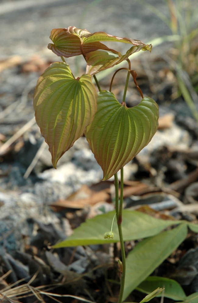 Mô tả: Rễ nạc, số lượng thay đổi, to bằng ngón tay. Thân mọc đứng, cao 10-50cm, phân nhánh, mọc bò hay quấn, màu đo đỏ, tối. Lá mọc so le, dạng tim, kéo dài, nhọn, dài 6-8cm, rộng 5-6cm; gân chính 9-13 màu đỏ. Hoa ở nách lá, xếp 1-2 cái, màu đo đỏ hay trắng lục, các mảnh ngoài hình dải, nhọn mũi, dài 22-23mm, rộng 4mm; 2 mảnh trong hình ngọn giáo, thuôn, dài 22mm, rộng 7,5mm. Quả dạng quả nang, hình nón dẹp, cao 1cm, nở thành hai van, chứa 2 hạt có áo hạt trắng và xẻ tua.