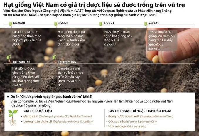 Từ tháng 12/2020, Viện Công nghệ vũ trụ và Viện Nghiên cứu khoa học Tây nguyên - Viện Hàn lâm Khoa học và Công nghệ Việt Nam đã lựa chọn được 10 gram hạt giống thảo mộc mọc tự nhiên có giá trị dược liệu như Đảng sâm (Codonopsis javanica (Bl.) Hook.f.et Thomas); Lưỡng luân chân vịt (Diplocyclos palmatus (L.) Jeffrey) và một số hạt giống thực vật có giá trị trang trí hoặc tinh dầu thơm như: Bóng nước eberhardt (Impatiens eberhardtii Tard), Cúc sao nhái (Cosmos bipinnatus Cav), Hoa mào gà (Celosia cristata), phù hợp với các yêu cầu kỹ thuật của JAXA.