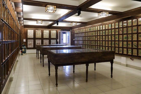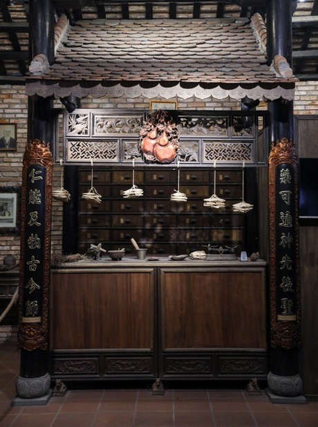 Một căn phòng phục dựng lại mô hình của nhà thuốc Đông y vào khoảng thế kỷ 19. Nhà thuốc với đầy đủ bảng hiệu, nơi bốc thuốc, bàn bắt mạch, tủ ngăn kéo, các dụng cụ bào chế...