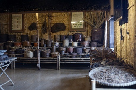 Cạnh đó là phòng trưng bày mô hình nhà thuốc Nam với phong cách nhà tranh mái lá đơn sơ thường thấy ở thôn quê. Nhiều loại thuốc Nam khá phổ biến như đinh lăng, hà thủ ô, trà xanh, đậu đen, tía tô... được sao khô và trưng bày trong những chiếc giỏ đan bằng tre.