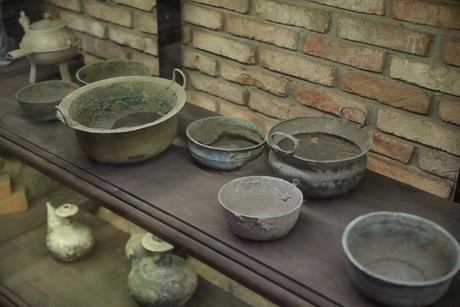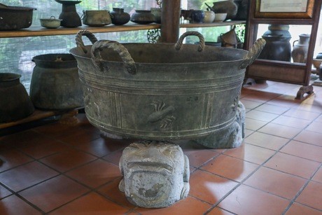 Chiếc nồi sao thuốc bằng đồng loại lớn có hoa văn tinh xảo được đúc khoảng thế kỷ 19. Cạnh đó là nhiều dụng cụ bào chế thuốc truyền thống như nồi, ấm sắc, dao cầu, thuyền tán, bàn nghiền, chày cối đá...