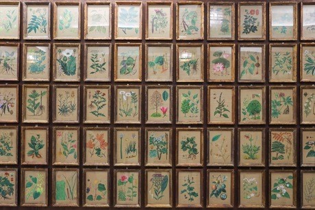 600 bức tranh vẽ tay về các cây thuốc của Việt Nam được treo trên tường.