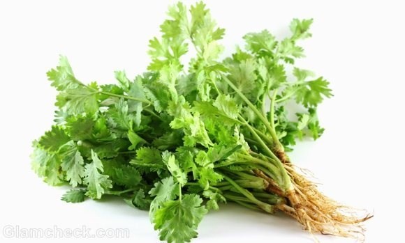 Bài 6: Làm đẹp da, trị mụn: Giã nát rau mùi lấy nước cốt khoảng 1 thìa cà phê trộn 1 chút bột nghệ, rửa mặt thật sạch rồi bôi hỗn hợp này lên mặt mỗi tối trước khi đi ngủ hoặc thường xuyên lấy quả mùi sắc nước rửa. Bài thuốc này tốt cho những người có da khô, da mặt có mụn sẽ giúp da mặt hồng hào, giảm mụn.