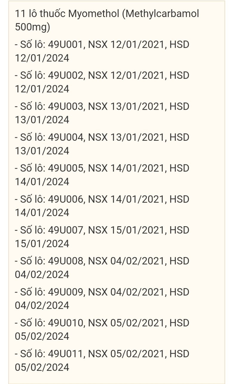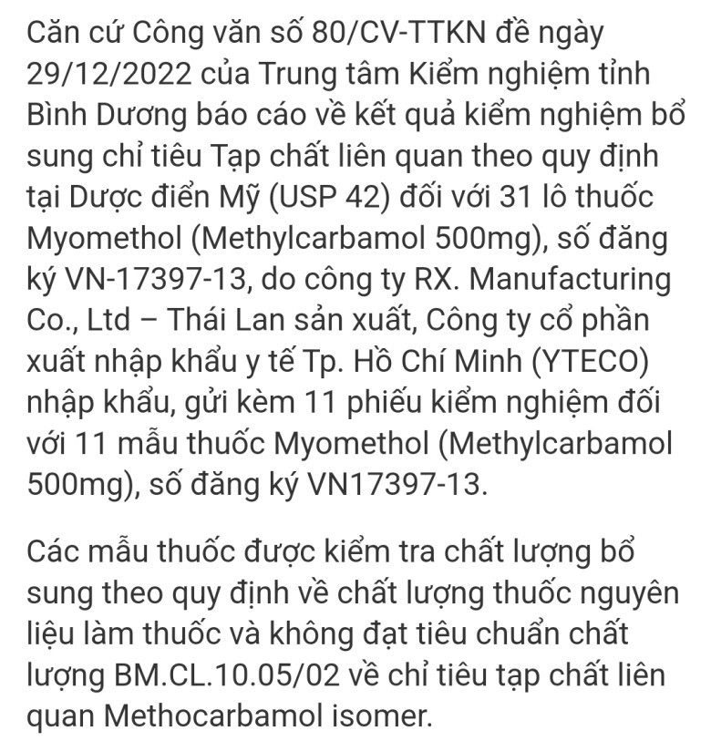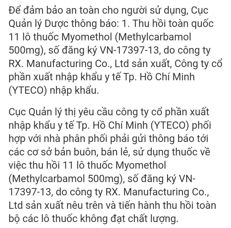 Cục Quản lý thị yêu cầu công ty cổ phần xuất nhập khẩu y tế Tp. Hồ Chí Minh (YTECO) phối hợp với nhà phân phối phải gửi thông báo tới các cơ sở bản buôn, bán lẻ, sử dụng thuốc về việc thu hồi 11 lô thuốc