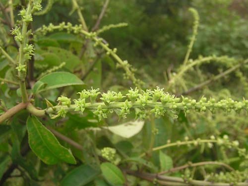 Mô tả: Cây gỗ nhỏ nhưng cũng có thể cao đến 15m, nhánh có lông hình khiên màu gỉ sắt. Lá có phiến thon, to, dài 15-20cm, mép có răng nằm thưa, không lông, gân phụ 12-15 cặp, cuống không có tuyến. Bông đứng từ ngọn nhánh, cao 20-30cm; hoa đực có 5 cánh hoa trắng, 10-11 nhị, chỉ nhị có lông; bầu có 3 vòi nhuỵ chẻ hai từ giữa. Quả nang to 9mm.