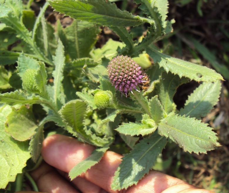 Mô tả: Cây thảo cao 40-50cm, có lông dày đặc, thân có cánh hẹp, có răng nhỏ. Lá không cuống, phiến thon hẹp nhọn, dài 2,5-4cm, rộng 0,1-1cm, mép có răng nhọn, hai mặt lá đều có lông dày. Hoa đầu kép to đến 1cm, màu tía; hoa đầu đơn nhỏ có lá bắc có răng, trong trong, dài 3mm, chứa vài hoa hình ống. Quả bế với tràng hoa còn lại dày, kín thành phao.