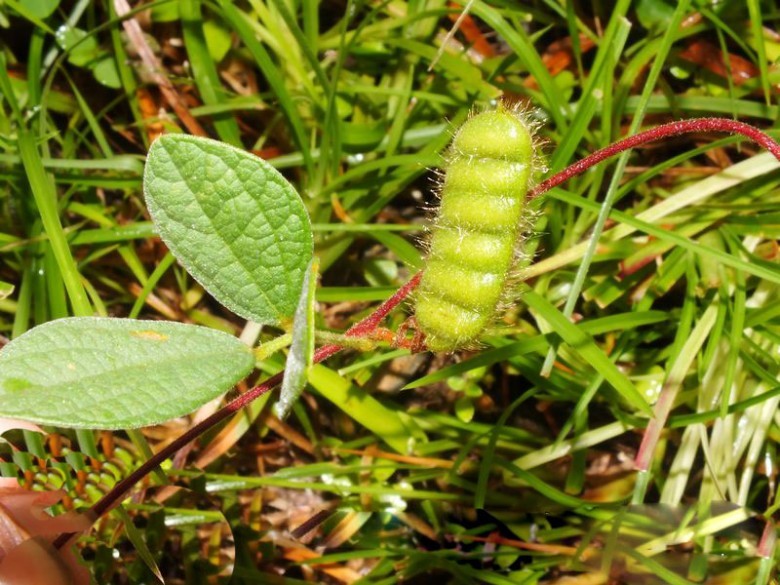 Mô tả: Cây thảo leo hay trườn, nhánh dạng sợi, có lông như nhung màu vàng hoe. Lá có 3 lá chét hình bầu dục hẹp, dày, dài 2-3,5cm, rộng 1-1,5cm, tù ở đầu và ở gốc, có lông tuyến trên cả hai mặt; gân bên 3 đôi; cuống lá 2-4cm; lá kèm nhỏ. Cụm hoa chùm 1-3 hoa, màu vàng hay xanh xanh. Ðài dạng chuông, có 4 thuỳ. Cánh hoa có mép; cánh cờ xoan ngược có tai nhọn; cánh thìa tù. Bầu có nhiều tơ dài. Quả đậu thuôn, có ngấn giữa các hạt, có lông lởm chởm, có tuyến, dài 2cm, rộng 0,5cm, hạt 5-6, thuôn, màu đen hay vàng sậm.