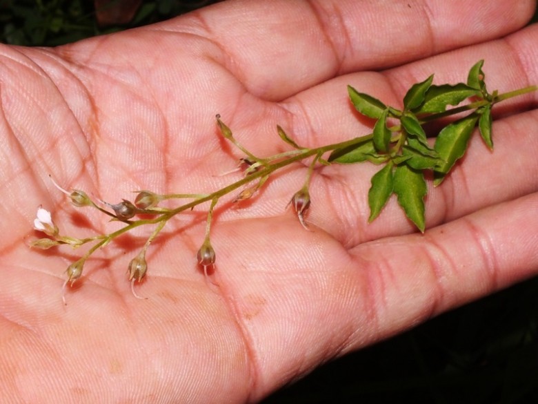 Mô tả: Cây thảo phân nhánh, cao 30-40cm, nhánh không lông. Lá mọc đối, phiến hình bánh bò, dài 1,5-3cm, rộng 1-1,7cm, mép có răng ở phần trên, gân phụ mọc chéo, 5 cặp; cuống dài 1-1,5cm. Chuỳ đứng cao 10-13cm, và dài thêm ra khi có quả; cuống hoa dài 5mm, hoa trắng; đài hình chuông, dài 4-5mm; tràng hình chuông dài bằng hai đài; nhị dài mọc cao ra ngoài hoa. Quả nang hình cầu, to 2,5-3,5mm, hạt nhiều.