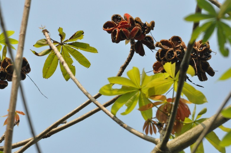 Mô tả: Cây gỗ cao 6-9m; nhánh non to 1cm. Lá do 7-9 lá chét không cuống, dài 10-20cm, mặt dưới đầy lông hoe; cuống dài 20-55cm; lá kèm 5mm. Cụm hoa là chùm (tới 7 chùm) dài 20cm, có lông hình sao. Hoa tạp tính, hoa đực có 10-12 bao phấn; hoa lưỡng tính có bầu có lông vòi cong, đầu nhuỵ đen, lá noãn 5, mỗi lá noãn chứa 6 noãn.