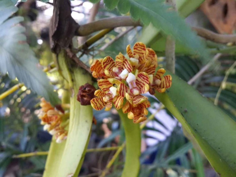 Mô tả: Lan to, có thân leo cao đến 80cm, to 1-1,5cm, có bẹ bao, giòn dễ gãy, rễ khí sinh to. Lá có phiến to, dày, dài 17-40cm, rộng 3,5-4cm, đầu tù, có 2 thuỳ không bằng nhau; có đốt trên bẹ. Cụm hoa chùm dài, chia nhánh, có nhiều hoa; hoa có bầu và cuống dài 1cm; phiến hoa mập, dài 1cm, vàng có sọc tía, cánh môi trắng, sau vàng, thuỳ bên có lông ở mặt trên, móng hình chuỳ, xanh xanh. Quả nang dài 5cm, có 6 cạnh.