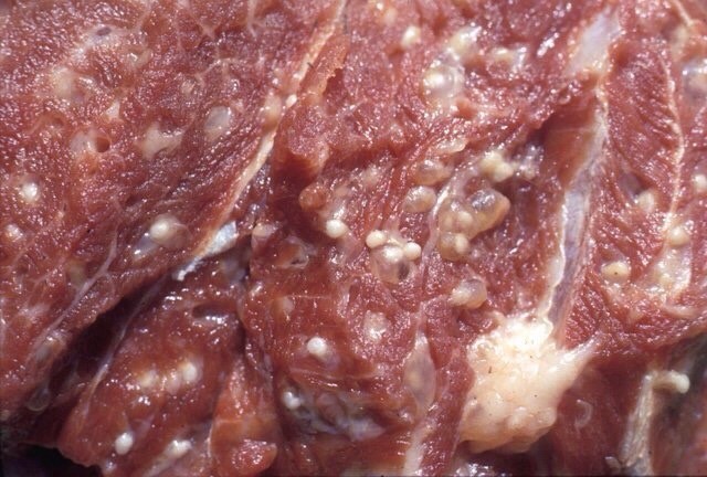 Theo Cục Y tế dự phòng, Bộ Y tế, người ăn phải trứng sán dây lợn nhiễm trong thức ăn, sau khi ăn hay nuốt phải trứng sán, trứng vào dạ dày, nở ra ấu trùng, đến ruột non, ấu trùng xuyên qua thành ống tiêu hóa vào máu và di chuyển đến ký sinh tại các cơ vân, não, mắt,…, trường hợp này là nhiễm từ môi trường bên ngoài cơ thể nên có thể thấy ít ấu trùng ở các mô.