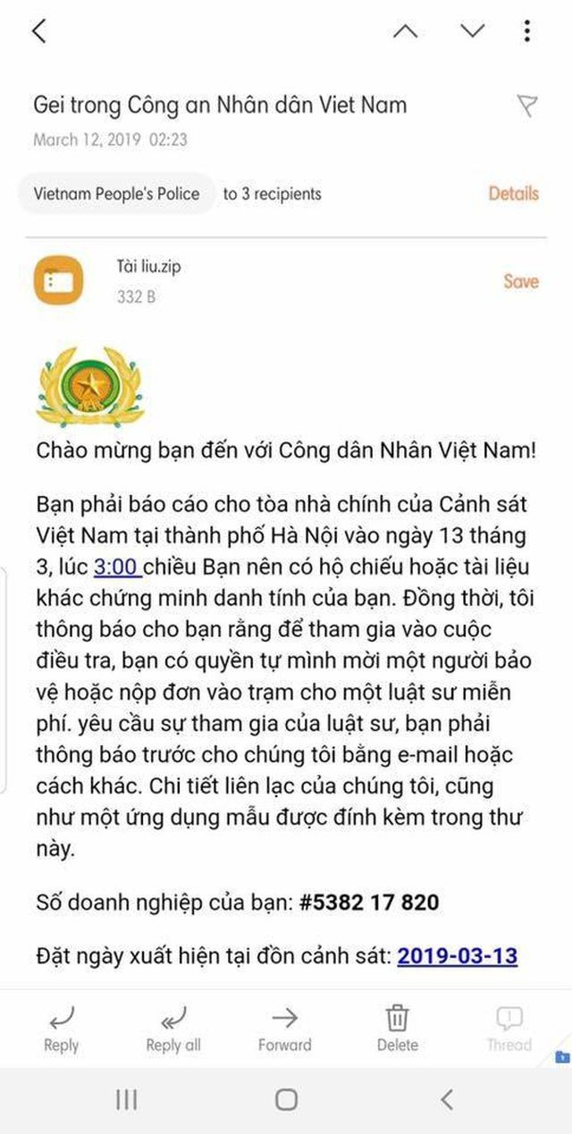 Email chứa mã độc tống tiền GandCrab 5.2 giả danh Bộ Công an.