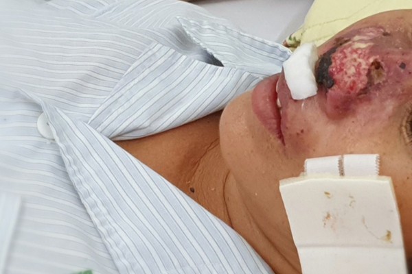 Rất may bệnh nhân chỉ tổn thương da ở cánh mũi, chưa tổn thương xương. Sau 2 tuần điều trị, vết thương đã hết mủ và đang ăn da non.