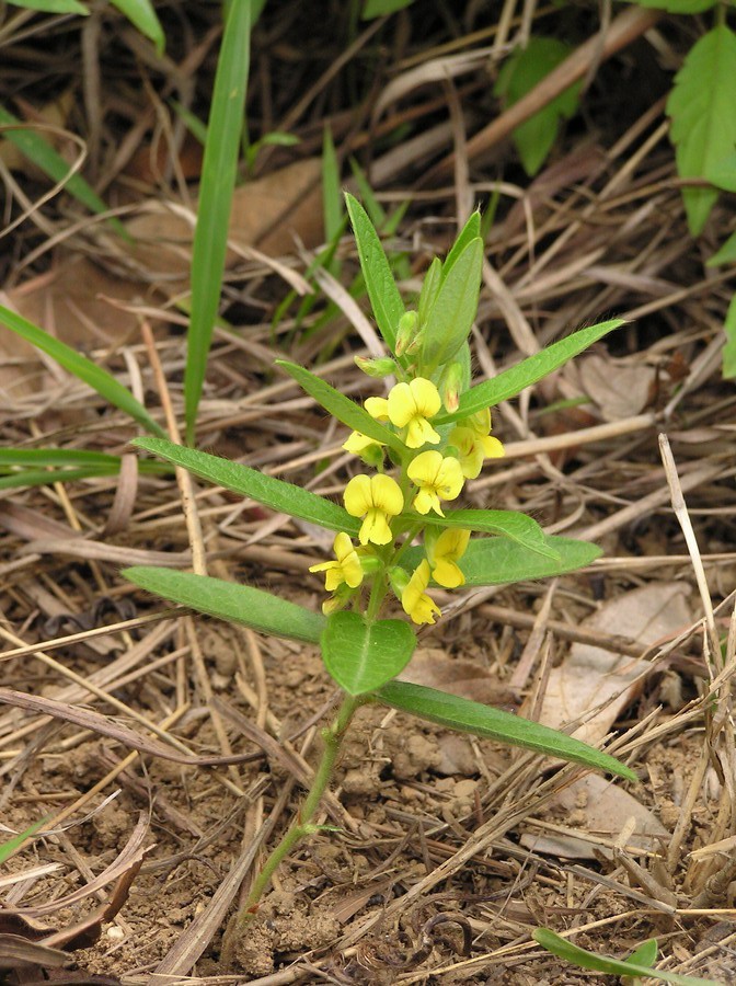 Mô tả: Cây thảo cao 15-50cm. Rễ phình thành củ, dạng con thoi. Nhánh mọc đứng có lông màu hung đỏ. Lá có một lá chét thuôn dài, dài 2,5-6cm, rộng 1-2cm, tù ở gốc, hơi nhọn mũi ở đầu, có lông mềm ở mặt trên và có lông rậm màu trăng trắng ở mặt dưới; gân phụ 5- 7 đôi, hướng lên; cuống lá có lông cứng, dài 2mm; lá kèm dạng sợi. Cụm hoa chùm ngắn, 6-10mm ở nách lá, có 1-3 hoa hầu như không có cuống; đài hình chuông có lông, với 5 thuỳ rời; các cánh hoa màu vàng; nhị 2 bó; bầu 2 noãn, có lông màu trắng. Quả đậu có lông rậm, màu hung đỏ, hình trái xoan bầu dục, chứa hai hạt màu đen, hình thận, gần như hình móng ngựa.