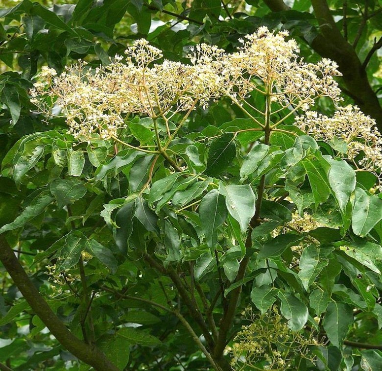 Mô tả: Cây gỗ không gai, cành non có lông ngắn. Lá mọc đối, trục chung dài 18cm, mang lá chét mọc đối, dài 14cm, rộng 5cm, mỏng, mốc mốc, có lông nằm và tuyến đỏ ở mặt dưới, mép uốn xuống, gân phụ 5-10 cặp. Chuỳ hoa mang tán cao 8cm, rộng 12cm, cuống 5-6mm, có lông; hoa có 5 lá đài, hình tam giác, có lông; 5 cánh hoa, cao2-3mm; 5 nhị với chỉ nhị có lông; bầu có 5 vòi nhuỵ. Quả đại 5, cao 5mm rộng 8mm; hột 1, màu đen.