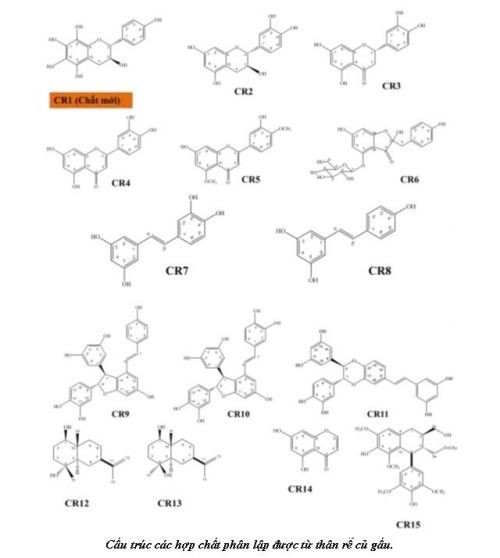 6 hợp chất thuộc lớp flavonoid (CR1-CR6), 5 hợp chất thuộc lớp chất stillbenoid (CR7-CR11), 2 hợp chất thuộc lớp chất terpenoid (CR12, CR13), 1 hợp chất thuộc lớp chất chromone (CR14), 1 hợp chất lignan (CR15). Trong đó, hợp chất (±)-3,5,6,7,8,4'- hexahydroxyflavane (CR1) là hợp chất mới lần đầu tiên được công bố; và có 6 hợp chất lần đầu tiên được phân lập từ loài C. rotundus L. là CR3, CR5, CR6, CR11, CR14, CR15.
