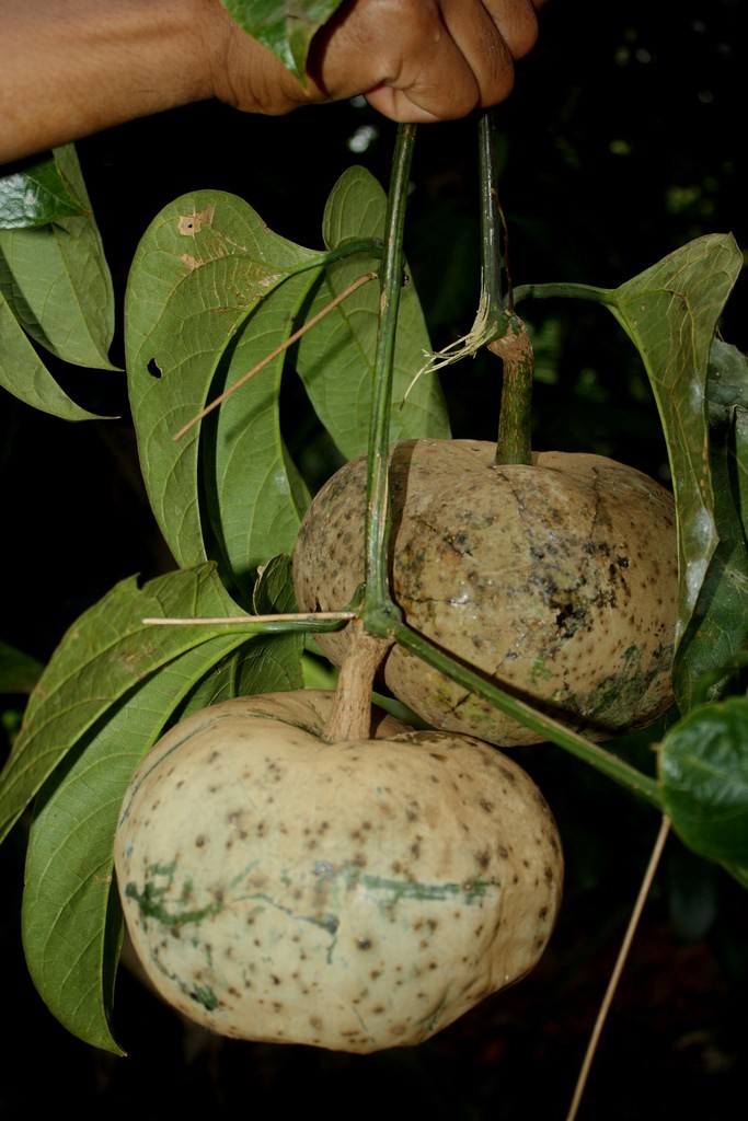 Mô tả: Dây leo có thân khoẻ, phân cành nhiều, tua cuốn rất mập, chẻ đôi. Lá mọc so le chia 3-7 thuỳ, đôi khi 5 thuỳ xẻ hình bàn tay, mặt trên màu lục, mặt dưới nhạt. Hoa đơn tính hình ống dài đến 20cm; hoa đực họp thành chùm; hoa cái riêng lẻ ở nách lá. Quả tròn hình cầu hơi có cạnh, to bằng quả bưởi. Hạt 8-12, to, dẹt và khum, có nội nhũ chứa dầu.