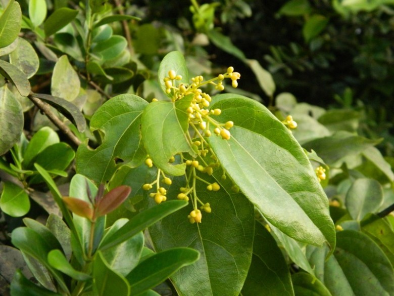 Mô tả: Dây mọc trườn, to, nhánh non có lông. Lá có phiến cứng, cỡ 9x4cm, đầu nhọn hay tù, không lông, gân gốc 3. Chuỳ hoa mang hoa đều; hoa vàng, lá đài ngoài cao 2,5mm, lá đài trong to hơn, cánh hoa nhỏ, 6-8 nhị. Quả hạch xoan dài 10-12mm, đỏ.