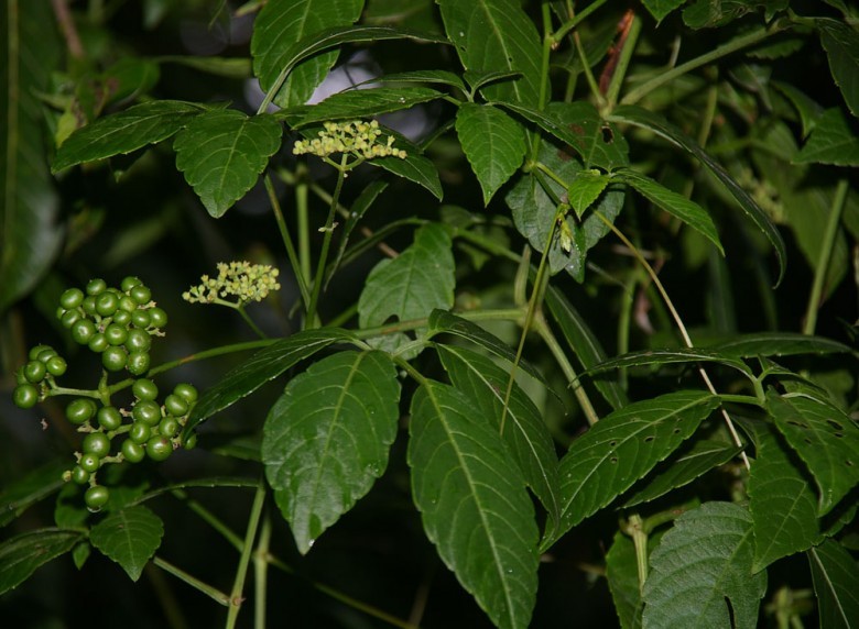 Mô tả: Dây leo, có ít lông hay không lông, vòi 2-3 nhánh. Lá mang 5 lá chét xếp hình chân vịt; lá chét bên có cuống phụ chung, phiến không lông; gân phụ 5-6 cặp. Tán hoa hay ngù ở nách lá; đài có 4 răng, cánh hoa 4, màu trắng; nhị 4; đĩa mật 4 thùy. Quả mọng tròn, to bằng đầu đũa, khi chín có màu tím đen, hạt 3-4, nhăn.