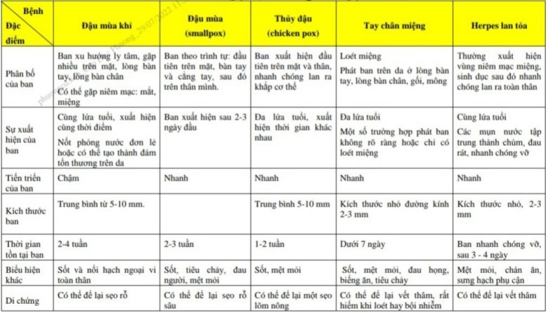 Bộ Y tế cho biết, bệnh đậu mùa khỉ tiến triển chậm, trong khi bệnh đậu mùa, thủy đậu, tay chân miệng, Herpes lan tỏa tiến triển nhanh. Kích thước ban của đậu mùa khỉ hay thủy đậu giống nhau, từ 5-10mm, trong khi ban của tay chân miệng hay Herpes lan toả nhỏ hơn, chỉ 2-3mm.